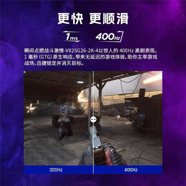 400Hz高刷 更流畅也更酣畅 在分秒必争的电竞游戏中,显示器的刷新率与响应速度尤为重要。VX25G26-2K-4支持原生360Hz超频400Hz高刷新率,远超传统144Hz标准,让玩家在FPS、MOBA、赛车等高速动态游戏中拥有更顺滑的画面并做出更精准的操作。配合1ms GTG疾速响应时间,有效消除拖影与动态模糊,使得画面切换更加干净利落。