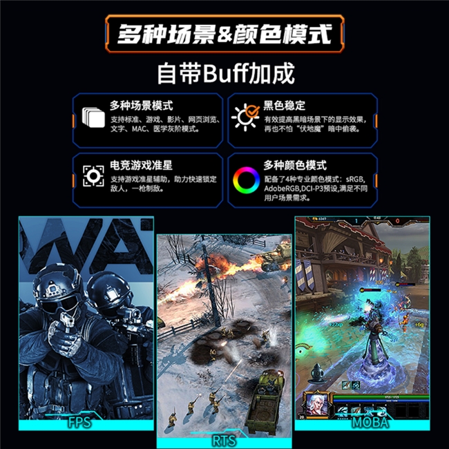 显示器采用Fast IPS快速液晶面板,不仅提升灰阶响应速度,还兼顾色彩表现与广视角优势,让高速运动画面保持清晰稳定;配合FreeSync & G-Sync防撕裂技术,可根据显卡输出动态调整刷新率,消除画面撕裂与卡顿现象,确保每一帧游戏画面的流畅性。 为了进一步为玩家操作加成,VX25G26-2K-4拥有电竞游戏准星和黑色稳定功能,以及猫眼视角、夜间视角、鹰眼视角等多种游戏辅助模式,大幅提升暗部细节可见度,让玩家在暗处也能清晰捕捉敌人、快速瞄准锁定,提升胜率。此外,针对不同游戏类型,VX25G26-2K-4内置多种ViewMode模式和多种色域颜色模式,包括FPS Game、RTS Game、MOBA Game、影片、网页浏览、文字、MAC、医学灰阶等,用户可根据场景快速切换预设参数,获得更契合的视觉,享受酣畅淋漓的竞技体验。