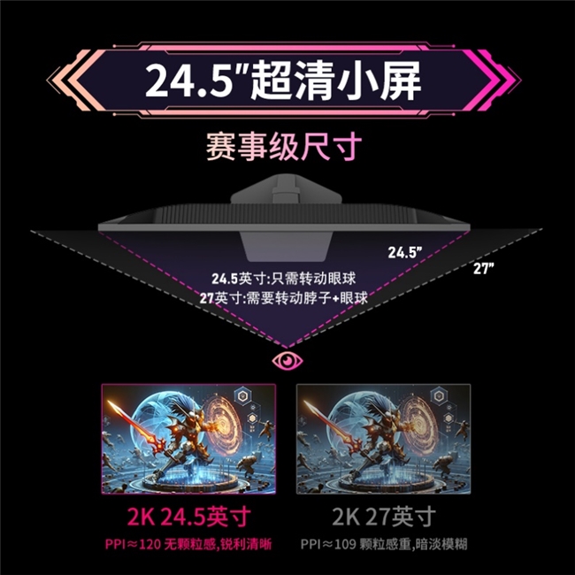 24.5英寸赛事尺寸 画质与操控感双优 VX25G26-2K-4 采用 24.5 英寸赛事级黄金尺寸,在相同2K分辨率下,相比27英寸拥有更高 PPI 像素密度,单位面积像素更密集,画面边缘无锯齿、文字更锐利、图像更细腻。小尺寸搭配2K高分辨率,让视野更紧凑、更聚焦,FPS游戏定位更精准,长时间对战更轻松,真正贴合职业电竞的观看与操作习惯。 其2K分辨率(2560×1440)带来细腻无颗粒感的画面呈现,纹理与光影表现更具层次感。无论是游戏还是视频,都能精准呈现出真实内容,为玩家带来细节满满的沉浸体验。