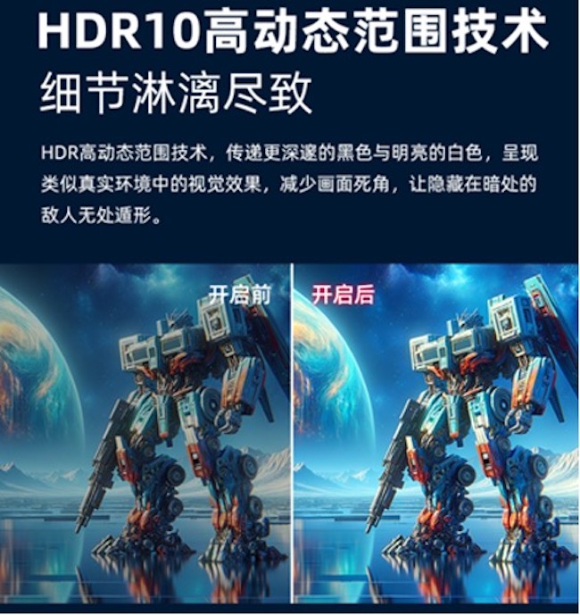 搭配HDR10功能,使画面的高光、阴影过渡呈现出更加平滑自然的渐变,细节过渡更为细腻、边界层次更为清晰。无论是赛博场景中的霓虹光影与金属质感,还是广袤荒原的天空云层与地表纹理,VX25G26-2K-4均能实现稳定、可靠的色彩呈现,为玩家带来更具真实感的视觉体验。